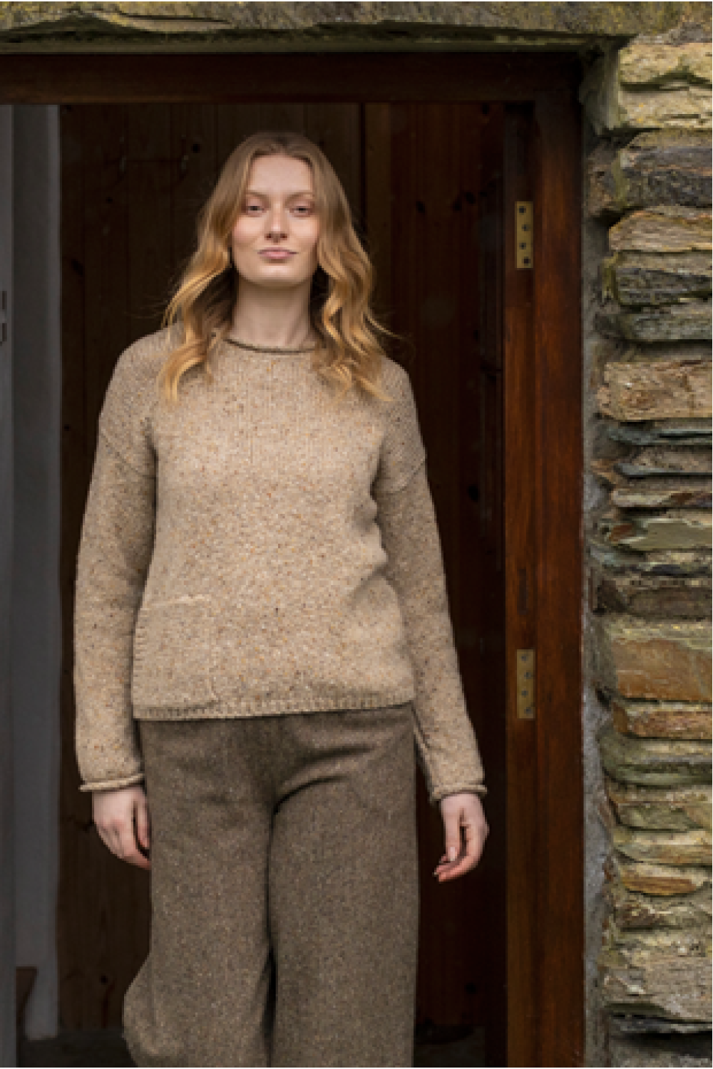 Stoere maar vrouwelijke trui. Lekker losvallend, beetje nonchalant. Met eigenwijs zakje aan de voorkant. Het achterpand is gekanteld gebruikt (qua breirichting). Gemaakt van 100% mulesing-vrije merino wol. Gemêleerd met "flecks" van bordeaux, roze, paars en petrol. De trui valt mooi op de heup met een iets langere achterkant. Easy chique look!