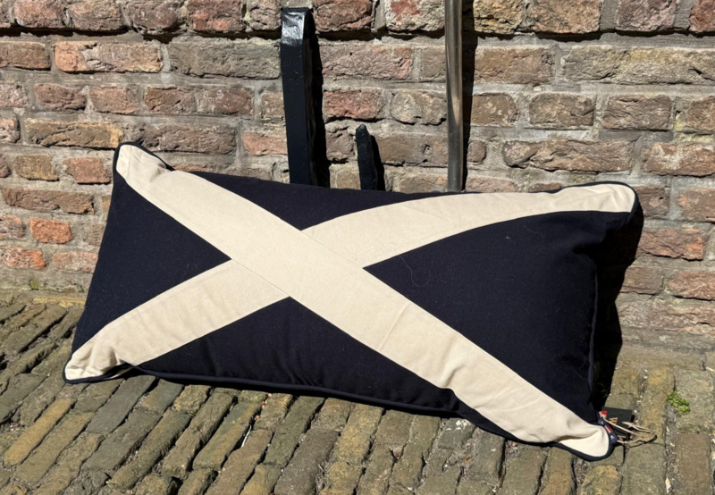 Vintage Saltire / Schotse vlag kussen rechthoekig XLVintage kleuren, stoer formaat. Dit XL Saltire / Schotse vlag patchwork gemaakt kussen is natuurlijk heel herkenbaar met die vlag. Naast groot (heel groot) is het van hoogwaardige Duck Cotton* vervaardigd. Heerlijk stevig…